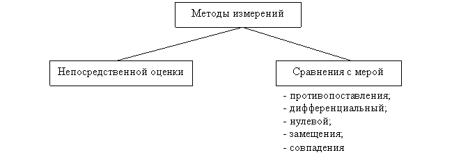 Метод противопоставления, при котором измеряемая и воспроизводимая величина одновременно воздействуют на прибор сравнения, с помощью которого устанавливается соотношение между величинами. Пример: измерение веса с помощью рычажных весов и набора гирь. Дифференциальный метод, при котором на измерительный прибор воздействует разность измеряемой величины и известной величины, воспроизводимой мерой. При этом уравновешивание измеряемой величины известной производится не полностью. Пример: измерение напряжения постоянного тока с помощью дискретного делителя напряжения, источника образцового напряжения и вольтметра Нулевой метод, при котором результирующий эффект воздействия обеих величин на прибор сравнения доводят до нуля, что фиксируется высокочувствительным прибором – нуль-индикатором. Пример: измерение сопротивления резистора с помощью четырехплечевого моста, в котором падение напряжения на резисторе с неизвестным сопротивлением уравновешивается падением напряжения на резисторе известного сопротивления. Метод замещения, при котором производится поочередное подключение на вход прибора измеряемой величины и известной величины, и по двум показаниям прибора оценивается значение измеряемой величины, а затем подбором известной величины добиваются, чтобы оба показания совпали. При этом методе может быть достигнута высокая точность измерений при высокой точности меры известной величины и высокой чувствительности прибора. Пример: точное точное измерение малого напряжения при помощи высокочувствительного гальванометра, к которому сначала подключают источник неизвестного напряжения и определяют отклонение указателя, а затем с помощью регулируемого источника известного напряжения добиваются того же отклонения указателя. При этом известное напряжение равно неизвестному. Метод совпадения, при котором измеряют разность между измеряемой величиной и величиной, воспроизводимой мерой, используя совпадение отметок шкал или периодических сигналов. Пример: измерение частоты вращения детали с помощью мигающей лампы стробоскопа: наблюдая положение метки на вращающейся детали в моменты вспышек лампы, по известной частоте вспышек и смещению метки определяют частоту вращения детали.