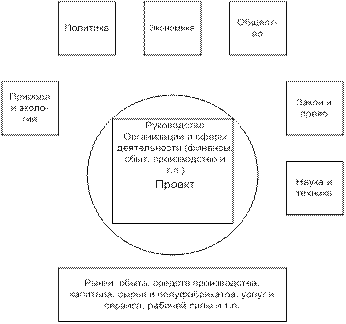 4. Окружающая среда проекта. Осуществление проекта происходит в некоторой динамической среде, которая оказывает на него определенное воздействие, т.е. в окружающей среде. Окружающая среда —совокупность внешних и внутренних (в отношении проекта) факторов, влияющих на достижение результатов проекта. Необходимо уметь определить и рассчитать все виды статических и динамических нагрузок, учесть все возможные воздействия: экономические, социальные, финансовые, организационные и др. В определенных условиях каждое из таких воздействий может оказаться критическим для проекта и привести к его «разрушению». Факторы окружения проекта должны быть проанализированы, и те из них, которые могут оказать на реализацию проекта заметное влияниe, необходимо выделить. На рис. 7 приведена схема окружения проекта.