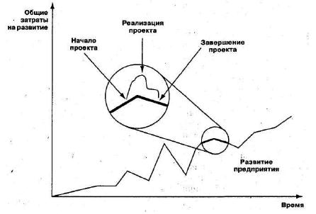 Рис. 7. Окружение проекта Проект нельзя отделить от окружающих условий и их развития. Значит, необходимо заблаговременно изучать и учитывать непосредственное (само предприятие) и дальнее окружение проекта (окружение предприятия). Их изменения могут впоследствии сыграть решающую роль в достижении успеха. При определении очерёдности реагирования на различные факторы, целесообразно воспользоваться принципом Эйзенхаура, согласно которому все проблемы, цели, задачи делятся на 4 группы: - важные и срочные; - важные, но не срочные; - срочные, но не важные; - не срочные и не важные. Рассмотрим коротко влияние па проект основных факторов. Проект и предприятие. Во время реализации проекта продолжается повседневная жизнь предприятия с его производством, сбытом и управлением. Нормальная, длительное время функционирующая организация является основой для возникновения потребности в изменениях и новшествах, что в результате ведет к возникновению проекта. Когда же проект по-настоящему начат, он получает вскоре самостоятельную жизнь. Во время осуществления проекта его участники концентрируются на выполнении своих заданий. Они живут, думают и действуют в мире их проекта. В рамках долговременной организации - предприятия возникла маленькая, относительно кратковременная организация «проект» (рис. 8). Рассмотрим влияние самого предприятия, т.е. факторов «ближнего окружения проекта», на проект. Руководитель предприятия определяет цели и основные требования к проекту. Руководство предприятия обобщает отдельные требования экспертов исходя из стратегии развития организации и к этому добавляет, например: - требования к результатам проекта; - требования к реализации проекта; - методику и порядок корректировки цели и требований к проекту со стороны отделов и специалистов предприятия и др.