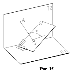 Для построения ортогональной проекции точки на плоскость, когда угол проецирования a=900, (рис. 15) достаточно установить на эту плоскость систему координат (ПСК), определить координаты проецируемой точки в этой системе координат и приравнять нулю z-координату. Например, если ПСК установлена на плоскость D и точка А имеет в этой ПСК координаты (50,60,70), то ортогональная проекция точки А на плоскость D - это точка АD (50,60,0).