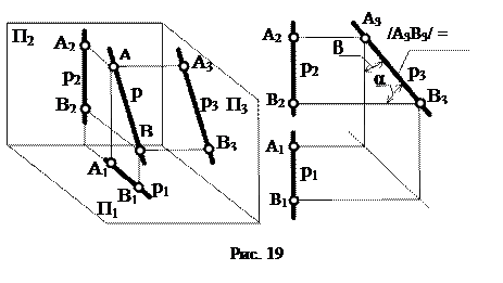 Горизонталь обозначают буквой h. Ее фронтальная проекция h2 всегда перпендикулярна вертикальным линиям связи, а горизонтальная проекция h1 отражает положение прямой в пространстве. Отрезок /AB/ и углы наклона β, γ к плоскостям проекций П2 , П3 проецируются на плоскость П1 без искажения. Фронталь обозначают буквой f. У фронтали всегда перпендикулярна линиям связи горизонтальная проекция f1, а фронтальная проекция f2 соответствует положению самой прямой в пространстве. Углы наклона α и γ к плоскостям П1 и П3 соответственно, а также отрезок /АБ/ фронтали, проецируются на П2 без искажения. Профильную прямую обозначают буквой p. Ее фронтальная p2 и горизонтальная p1 проекции совпадают с одной вертикальной линией связи, а профильная проекция p3 отображает положение прямой в пространстве. Без искажения проецируются на П3 отрезок /AB/ и углы наклона α, β профильной прямой к плоскостям П1 и П2 соответственно. В зависимости от перпендикулярности к той или иной плоскости проекций прямые называют горизонтально, фронтально или профильно проецирующие.