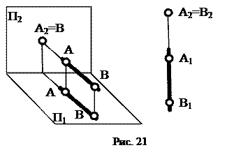 Горизонтально проецирующая прямая – прямая, перпендикулярная П1 (рис. 20). Горизонтальная проекция этой прямой (А1=В1) вырождается в точку, а фронтальная проекция (А2В2) совпадает с линией связи. Очевидно, что горизонтально проецирующая прямая одновременно параллельна П2 и П3, следовательно, /A2B2/ = /A3B3/ = /AB/. Фронтально проецирующая прямая – прямая перпендикулярная П2 (рис. 21). Фронтальная проекция этой прямой (А2=В2) вырождается в точку, а горизонтальная проекция (А1В1) совпадает с линией связи. Фронтально проецирующая прямая параллельна П1 и П3, следовательно, /A1B1/ = /A3B3/ = /AB/. Профильно проецирующая прямая – прямая перпендикулярная П3 (рис. 22). Профильная проекция такой прямой (А3=В3) представляет собой точку, а горизонтальная и фронтальная проекции перпендикулярны линиям связи. Профильно проецирующая прямая одновременно параллельна П1 и П2, следовательно, /A1B1/ = /A2B2/ = /AB/. Точки, принадлежащие проецирующей прямой, называют конкурирующими относительно плоскости проекций, которой перпендикулярна прямая. Точки А и В на рис. 20 называются горизонтально конкурирующие, на рис. 21 и 22 соответственно фронтально и профильно конкурирующие. Конкурирующие точки применяются для определения видимости проекций геометрических фигур.