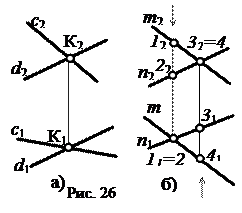 Таким образом, чтобы судить о параллельности прямых уровня необходимо иметь их проекции на плоскость, которой они параллельны. Если прямые пересекаются в пространстве, то их проекции тоже пересекаются и точки пересечения проекций К1, К2 принадлежат одной линии связи (рис. 26, а). Проекции скрещивающихся прямых m, n могут пересекаться (рис. 26, б), однако точки пересечения проекций не принадлежат одной линии связи. Точка пересечения горизонтальных проекций скрещивающихся прямых m и n является горизонтальной проекцией двух горизонтально конкурирующих точек 1 и 2. Точка пересечения фронтальных проекций этих прямых является фронтальной проекцией фронтально конкурирующих точек 3, 4.