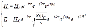 Рис. 18.7. Распространение напряженности магнитного поля в проводящей среде Мгновенные значения H и E определяются аргументом синуса, который в (18.20) зависит от z и