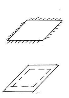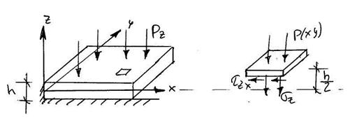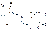 Из анализа картины деформаций элемента плиты можно заключить, что точки срединной поверхности в плоскости пластины не перемещаются (срединная поверхность z=0). Так как толщина плиты мала, то z тоже мал, поэтому можно написать, что: