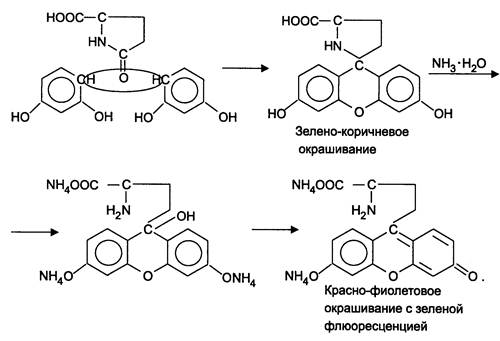 | | Серосодержащие аминокислоты. Для них общей является ковалентносвязанная сера, которую обнаруживают: 1) по реакции с нитропруссидом натрия в щелочной среде. HS – R + Na2[Fe(CN)5NO] + NaOH → Na2[Fe(CN)5-S-R] + NaNO3 + H2O красно-фиолетовое окрашивание 2) после минерализации метионина сплавлением с 30 % щелочью и последующем подкислении возникает резкий запах меркаптанов, аммиака и сероводорода. На фильтровальной бумаге, смоченной раствором нитропруссида натрия в пиперидине будет красно-фиолетовое пятно.