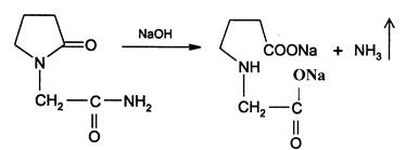 OH CH3-SNa + Na2S + 2 H2SO4 → H2S↑ + CH3SH + Na2SO4 + NaHSO4 Цистеин при аналогичных условиях выделяет сульфид натрия, имеющий резкий запах и вызывающий почернение бумаги, смоченной ацетатом свинца: Na2S + Pb(CH3COO)2 → PbS↓ + 2 CH3COONa Ацетилцистеин обнаруживают по ацетильной группе. Для этого сначала кипятят с раствором дихромата калия в серной кислоте, а затем проводят реакции на уксусную кислоту. Ее обнаруживают по запаху или по реакции образования уксусноэтилового эфира. Кроме того, тиогруппу в ацетилцистеине обнаруживают при добавлением FeCl3 по появлению синего окрашивания, которое быстро исчезает или при прибавлении NaNO2 по появлению красного окрашивания. Пеницилламин с фосфорно-вольфрамовой кислотой (H3PO4·WoO3) дает голубое окрашивание (меркаптогруппа). Пирацетам отличается наличием лактамной и амидной групп. Их открывают: 1) по выделению аммиака при кипячении препарата с 30 %-ным раствором щелочи: