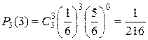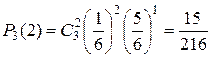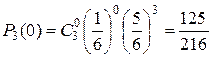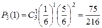События x 1, x 2, …, xn - образуют полную группу, т.е. р 1 + р 2 + … + рn = 1. Такую таблицу называют рядом распределения случайной величины X. 2). Графическое изображение. Для наглядности точки соединяются отрезками прямых. Такая фигура называется многоугольником распределения. Пример.Игральная кость брошена 3 раза. Написать закон распределения числа появлений шестерки. Решение. Вероятность появления шестерки при одном бросании p = 1/6, вероятность непоявления шестерки q = 1 – p = 5/6. При трех бросаниях игральной кости шестерка может появиться либо 3 раза, либо 2 раза, либо 1 раз, либо совсем не появиться. Таким образом, возможные значения X таковы: x 1 = 0, x 2 = 1, x 3 = 2, x 4 = 3. Найдем вероятности этих возможных значений по формуле Бернулли:
