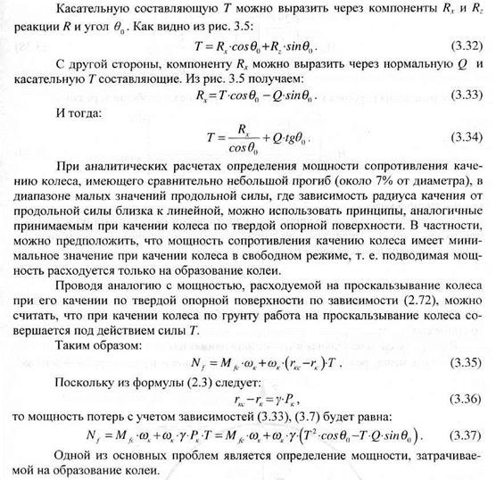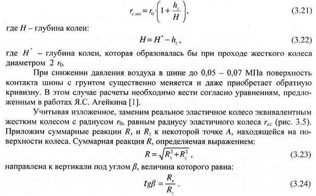 Рассмотренный пример приближенного построения формы линии контакта эластичного колеса с грунтом показывает сложность задачи учета формы контакта и особенно эпюр нормальных и касательных напряжений при определении параметров качения колеса по грунту. Воспользуемся известным понятием эквивалентного жесткого колеса, параметры поверхности контакта которого равновелики с эластичным колесом. Возможность такой замены была неоднократно подтверждена экспериментально. При качении колеса с номинальным давлением воздуха в шине величина деформации шины мала по сравнению с деформацией грунта и характер взаимодействия шины с деформируемым грунтом может быть описан зависимостями, аналогичными полученным для жесткого колеса, радиус которого г0 равен радиусу эластичного колеса. При прогибе шины более 7% от свободного диаметра, когда форма и размеры контакта меняются, радиус эквивалентного жесткого колеса определяется по следующей известной зависимости: