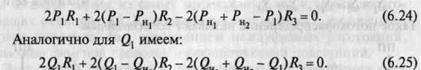 Функция (6.21) записана как функция шести переменных — потоков активной и реактивной мощностей по трем участкам линии с двусторонним питанием. Подставим в (6.21) вместо потоков по второму и третьему участкам их выражения через поток на первом участке и мощности нагрузок: