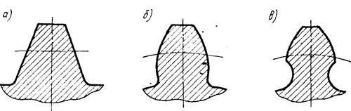 Подрезание зубьев возникает при нарезании методом обкатки колес с малым числом зубьев, т. е. если в нарезаемом колесе число зубьев z меньше минимально допустимого zmin. Подрезание заключается в том, что вершины зубьев режущего инструмента реечного типа внедряются в ножки зубьев нарезаемого колеса. На рис. 6 показано изменение формы прямого зуба в зависимости от числа зубьев нормального эвольвентного колеса. При z=oo колесо превращается в рейку (а). С уменьшением z уменьшается толщина зуба у основания и вершины, а кривизна эвольвентного профиля увеличивается (б). При дальнейшем уменьшении z (z ≤ zmin) появляется подрезание ножки зуба (в); изгибная прочность зуба резко снижается и возрастает износ из-за уменьшения длины активного участка профиля (срезается часть эвольвенты у ножки зуба). По границе отсутствия подрезания для прямозубых передач устанавливается минимально допустимое число зубьев zmin= 17. При необходимости нарезания зубьев меньше zmin, для устранения подрезания применяют зубчатые колеса со смещением.