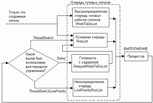 Рис. 4.5. Схема планирования потоков в NetWare Описанный невытесняющий механизм организации многопоточной работы в ОС NetWare v3.x и NetWare 4.x потенциально очень производителен, так как отличается небольшими накладными расходами ОС на диспетчеризацию потоков за счет простых алгоритмов планирования и иерархии контекстов. Но для достижения высокой производительности к разработчикам приложений для ОС NetWare предъявляются высокие требования, так как распределение процессорного времени между различными приложениями зависит в конечном счете от искусства программиста.