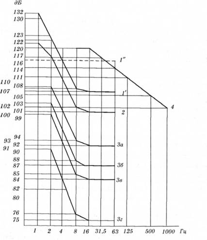 Рис 226 Гигиенические нормы вибрации: 1-3 - общая вибрация: V - вертикальная транспортная, И \"- горизонтальная транспортная 2 - транспортно-технологическая; За - технологическая в производственных помещениях, 36 - в служебных помещениях на судах х; Зв - в производственных помещениях, где нет вибрации; Зг - в помещениях административно-управленческих и для умственного труда, 4-локальная вибрациирація При использовании метода интегрированной оценки спектром частот параметром, нормируется, е корректируемых значение виброскорости или виброускорения (10, измеряемый с помощью специальных фильтре ей или вычисляется по формулам, приведенным в ДСН 336039-9-99. При действии непостоянной вибрации (кроме импульсной) параметром, нормируется, является вибрационная нагрузка (доза вибрации, эквивалентный отсортирован уровень), полученное рабочим в течение смены и зафиксирован не специальным прибором или вычисленное для каждого направления действия вибрации (X, У, 7!) По формуле