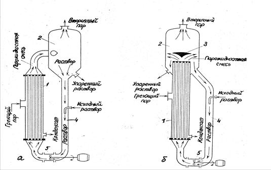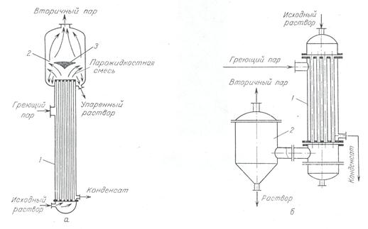 Их относят к группе аппаратов, работающих без циркуляции; процесс выпаривания осуществляется за один проход жидкости по кипятильным трубам, причем раствор движется в них в виде восходящей или нисходящей пленки жидкости. Как правило, эти аппараты работают при прямоточном движении раствора и образующегося вторичного пара, который занимает центральную часть труб. В связи с этим здесь отсутствует гидростатический столб парожидкостной смеси и, следовательно, гидростатическая депрессия. Для обеспечения заданных пределов изменения концентраций упариваемых растворов кипятильные трубы делают длинными (6- 10 м). Выпарной аппарат с восходящей пленкой жидкости (рис.1.12,а) работает следующим образом. Снизу заполняют раствором трубы на 1/4-1/5 их высоты, подают греющий пар, который вызывает интенсивное кипение. Выделяющийся вторичный пар, поднимаясь по трубам, за счет сил поверхностного трения увлекает за собой раствор. В сепараторе пар и раствор отделяются друг от друга. В выпарном аппарате с нисходящей пленкой жидкости (рис.1.12,б) исходный раствор подают в верхнюю часть нагревательной камеры 1, где обычно расположен распределитель жидкости, из которого последняя по трубам стекает вниз. Образующийся вторичный пар также движется в нижнюю часть нагревательной камеры, откуда вместе с жидкостью попадает в сепаратор 2 для отделения от раствора. Для снижения температуры кипения раствора процесс, как правило, проводят под вакуумом. В этих аппаратах удается упаривать также растворы, склонные к интенсивному пенообразованию. Вместе с этим пленочным аппаратам свойственен ряд недостатков. Они очень чувствительны к изменениям нагрузок по жидкости, в особенности при малых расходах растворов. Существует определенный минимальный расход раствора, ниже которого не удается достигнуть полного смачивания поверхности теплопередачи. Это может приводить к местным перегревам трубок, выделению твердых осадков, резкому снижению интенсивности теплопередачи. В таких аппаратах не рекомендуется выпаривать кристаллизующиеся растворы. Для них также требуются большие производственные площади.