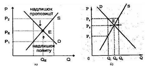 Графік 2.9. Механізм формування рівноважної ціни: а - за Л.Вальрасом (модель Л.Вальраса); б - за А.Маршаллом (модель А.Маршалла).