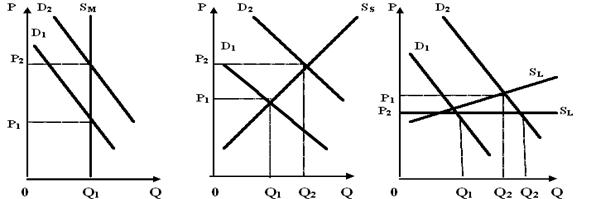 Загальновизнаний на сьогодні метод Л.Вальраса розглядає криві попиту та пропозиції як кінцеві точки горизонтальних прямих, які відповідають обсягам попиту чи пропозиції при даній ціні (тобто ціна розглядається як незалежна змінна, а кількість товару – як залежна). А.Маршалл розглядав їх як кінцеві точки ряду вертикальних ліній, кожна з яких відповідає ціні, за якою дана кількість товару виробляється і споживається (тобто А.Маршалл розглядає кількість товару як незалежну змінну, а ціну - як залежну змінну) (графік 2.9). Метод Л.Вальраса засновується на зміні динаміки ціни в напрямку досягнення стану рівноваги, тоді як підхід А.Маршалла базується на зміні динаміки обсягів товару; тобто Л.Вальрас розробив «модель коригування ринкових цін», тоді як А.Маршалл - «модель коригування випуску». Для функції пропозиції важливе значення має фактор часу. Звичайно розрізняють найкоротший, короткостроковий (короткий) і довгостроковий (тривалий) періоди. У найкоротшому періоді всі фактори виробництва постійні, у короткостроковому деякі фактори (сировина, робоча сила й ін.) є змінними, у довгостроковому - усі фактори змінні (включаючи виробничі потужності, число фірм у галузі тощо). В умовах найкоротшого ринкового періоду підвищення (зниження) попиту призводить до підвищення (зниженню) цін, але не відбивається на розмірі пропозиції (рис.2.10, а). В умовах короткострокового періоду підвищення попиту обумовлює не тільки ріст цін, але і збільшення обсягу виробництва, тому що фірми встигають змінити деякі фактори виробництва у відповідності з попитом (рис.2.10, б). В умовах довгострокового періоду збільшення попиту призводить до значного росту пропозиції при постійних цінах або несуттєвому підвищенні цін (мал.2.10, в).