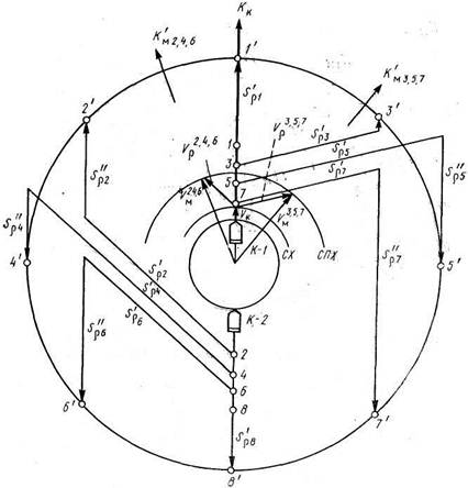 Рис 2. Построение в ордер с круговым охранением из строя кильватера,, когда охраняемые корабли находятся в центре строя На маневренный планшет наносят исходные позиции охраняемых кораблей и кораблей охранения. Наносят заданные позиции кораблей охранения в круговом ордере 1', 2', 3', 4', 5', 6', 7' и 8'. При центре планшета наносят вектор назначенной скорости V к. Под углом 20° влево от генерального курса откладывают вектор скорости кораблей охранения 2, 4, 6 - V м 2, 4, 6, под углом 40° вправо - вектор скорости кораблей охранения 3, 5, 7 - V м 3, 5, 7 . Соединяя конец вектора скорости V к с концами векторов скоростей V м 2, 4, 6 и V м 3, 5, 7 , получают векторы относительных скоростей V ρ 2, 4, 6 и V ρ 3, 5, 7. Из исходных позиций кораблей 2, 4, 6 и 3, 5, 7 проводят относительные курсы, параллельные соответствующим векторам относительных скоростей, до выхода каждого корабля на линию курса своей позиции.