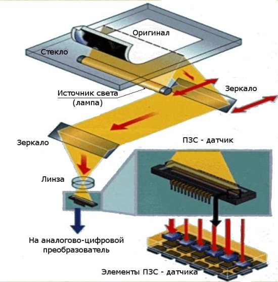 Кодирование Вторую фазу сканирования составляет процесс кодирования (или, как его иногда называют в специальной литературе по обработке сигналов, квантования) информации. Для его реализации используется специальное электронное устройство –цифро-аналоговый преобразователь (ЦАП). Для реализации процедуры сканирования необходимо наличие двух компонентов: аппаратного (сканер) и программного, используемого для управления аппаратными средствами, процессом и параметрами сканирования. Принцип работы однопроходного планшетного сканера состоит в том, что вдоль сканируемого изображения, расположенного на прозрачном неподвижном стекле, движется сканирующая каретка с источником света. Отраженный свет через оптическую систему сканера (состоящую из объектива и зеркал или призмы) попадает на три расположенных параллельно друг другу фоточувствительных полупроводниковых элемента на основе приборов с зарядовой связью (ПЗС), каждый из которых принимает информацию о компонентах изображения.
