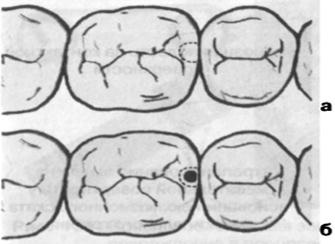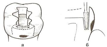 а – кариозная полость на контактной поверхности; б – трепанирование эмали на жевательной поверхности у основания окклюзионного ската маргинального гребня; в – расширение трепанационного отверстия; г – препарирование окклюзионной поверхности (создание дополнительной площадки, раскрытие фиссур).