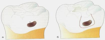 Полость формируется без дополнительной площадки, (не выводя ее на жевательную поверхность) только в пределах пораженной поверхности, полость раскрывают шаровидным алмазным бором, затем расширяют в пределах здоровых тканей.