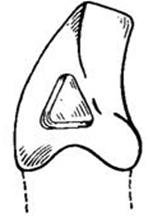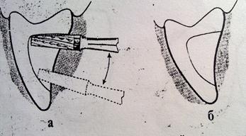 !!! Если кариозный процесс разрушил контактную и небную (язычную) поверхность – формируют дополнительную площадку. а) Основная полость треугольной формы формируется на контактной поверхности зуба с оральной поверхности.