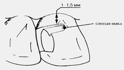 - если врачом было принято решение об иссечении слепой ямки и соединении ее с контактной полостью, формируется дополнительная опорная площадка. При ее создании следует придерживаться определенных правил. Придесневая стенка опорной площадки должна быть расположена на расстоянии 1-1,5 мм от края десны, перпендикулярно продольной оси зуба и переходить в придесневую;