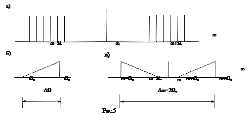 Из этого выражения видно, что амплитудно-модулированное колебание представляется суммой несущего колебания и двух боковых полос с частотными составляющими ω– Ώ и ω + Ω, расположенными симметрично относительно несущей частоты. Спектральный состав этого колебания представлен на рис. 5, а. Если исходный информационный сигнал С (t) имеет сплошной спектр