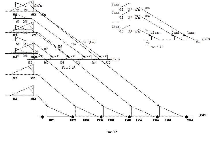 В системах передачи с числом каналов 300 и более из каждых пяти основных вторичных групп формируются основные третичные группы в диапазоне частот 812…2044 кГц (рис.12, кадр 11, внизу). Здесь предусматривается защитная полоса частот между вторичными группами шириной 8 кГц. В системах, рассчитанных на передачу нескольких тысяч каналов ТЧ, в аппаратуре из трех третичных групп формируются четверичные группы в диапазоне частот 8516…12388 кГц, содержащие 900 каналов ТЧ (кадр 12).