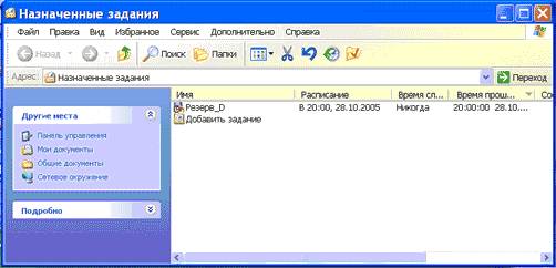 Для назначения задания необходимо выбрать команду Пуск/Программы/Стандартные/Служебные/Назначенные задания, откроется окно диалога