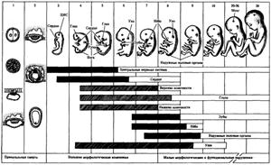 С конца XIX в. существует представление о наличии в онтогенетическом развитии периодов наибольшей чувствительности к повреждающему действию разнообразных факторов. Эти периоды получили название критических, а повреждающие факторы — тератогенных. Единодушия в оценке различных периодов, как более или менее устойчивых, не существует. Некоторые ученые полагают, что наиболее чувствительными к самым разнообразным внешним воздействиям являются периоды развития, характеризующиеся активным клеточным делением или интенсивно идущими процессами дифференциации. П. Г Светлов, в середине XX столетия внесший большой вклад в разработку проблемы, считал, что критические периоды совпадают с моментом детерминации, который определяет конец одной и начало другой, новой цепи процессов дифференциации, т.е. с моментом переключения направления развития. По его мнению, в это время имеет место снижение регуляционной способности. Критические периоды не рассматривают как наиболее чувствительные к факторам среды вообще, т.е. независимо от механизма их действия. Вместе с тем установлено, что в некоторые моменты развития зародыши чувствительны к ряду внешних факторов, причем реакция их на разные воздействия бывает однотипной. Критические периоды различных органов и областей тела не совпадают друг с другом по времени. Причиной нарушения развития зачатка является ббльшая чувствительность его в данный момент к действию патогенного фактора, чем у других органов. При этом действие разных факторов может вызвать одну и ту же аномалию. Это свидетельствует о неспецифическом ответе зачатка на повреждающие воздействия. В то же время некоторая специфичность тератогенных факторов выражается в том, что, будучи различными, они оказывают максимальное повреждающее действие не на одних и тех же стадиях развития. П. Г. Светлов установил два критических периода в развитии плацентарных млекопитающих. Первый из них совпадает с процессом имплантации зародыща, второй — с формированием плаценты. Имплантация приходится на первую фазу гаструляции, у человека —на конец 1-й —начало 2-й недели. Второй критический период продолжается с 3-й по 6-ю неделю. По другим источникам, он включает в себя также 7-ю и 8-ю недели. В это время идут процессы нейруляции и начальные этапы органогенеза. Повреждающее действие во время имплантации приводит к ее нарушению, ранней смерти зародыша и его абортированию. По некоторым данным, 50—70% оплодотворенных яйцеклеток не развиваются в период имплантации. По-видимому, это происходит не только от действия патогенных факторов в момент начавшегося развития, но и в результате грубых наследственных аномалий. Действие тератогенных факторов во время эмбрионального (с 3 до 8 нед) периода может привести к врожденным уродствам. Чем раньше возникает повреждение, тем грубее бывают пороки развития. Развивающийся организм можно уподобить большому вееру. Достаточно небольших нарушений у его основания, чтобы вызвать большие изменения во всем веере. При действии тератогенных факторов в фетальном периоде возникают малые морфологические изменения, задержка роста и дифференцировки, недостаточность питания плода и другие функциональные нарушения. У каждого органа есть свой критический период, во время которого его развитие может быть нарушено. Чувствител