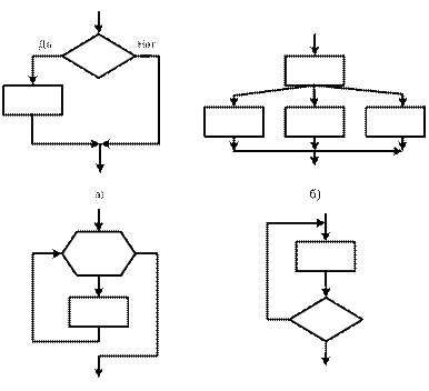 Рис.1.3 Базовые элементарные структуры. Так, первая из них (рис. 1.3, а) называется структурой типа последовательность (или просто последовательностью), вторая (рис. 1.3, б) — структурой выбора (разветвлением), третья (рис. 1.3, в) — структурой цикла с предусловием. При словесной записи алгоритма указанные структуры имеют соответственно следующий смысл: «выполнить S Рассматривая схему программы, можно выделить в ней части (фрагменты), достаточно простые и понятные по структуре. Представление этих фрагментов укрупненными блоками существенно облегчает восприятие алгоритма (а в дальнейшем и программы) в целом. Достаточно часто структурное программирование подразумевает использование более трех базисных структур. Применительно к языку Паскаль, в котором наиболее полно нашли свое отражение идеи структурного программирования, целесообразно при проектировании алгоритмов дополнительно использовать еще четыре элементарные структуры: сокращенную запись разветвления (рис. 1.4 а); структуру варианта (рис. 1.4 б); структуру повторения или цикла с параметром (рис. 1.4 в); структуру цикла с постусловием (рис. 1.4 г). Каждая из структур, показанных на рис. 1.3 и 1.4, имеет один вход и один выход. В языке Паскаль имеются средства (операторы), позволяющие непосредственно реализовать в программе любую из этих структур, поэтому правильное использование типовых структур в процессе разработки алгоритма обеспечивает упрощение последующих этапов решения задачи на ЭВМ. В качестве примера структурного подхода к проектированию алгоритма рассмотрим задачу табулирования функции, т. е. вычисление некоторой функции z =z(x) одной переменной х, изменяющейся от начального значения x Пусть функция z(x) имеет вид z(x)= sin x, если х ≤ а, где у = x
