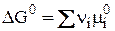 (ni > 0 – для продуктов, ni < 0 – для исходных веществ). Для одного пробега реакции, т.е. в случае, когда ξ = 1 (когда прореагировали вещества в количествах, равных их стехиометрическим коэффициентам: Dni = ni), в условиях постоянного состава системы (в условиях бесконечно большого количества всех компонентов, когда химический потенциал mi = сonst) изменение энергии Гиббса равно: