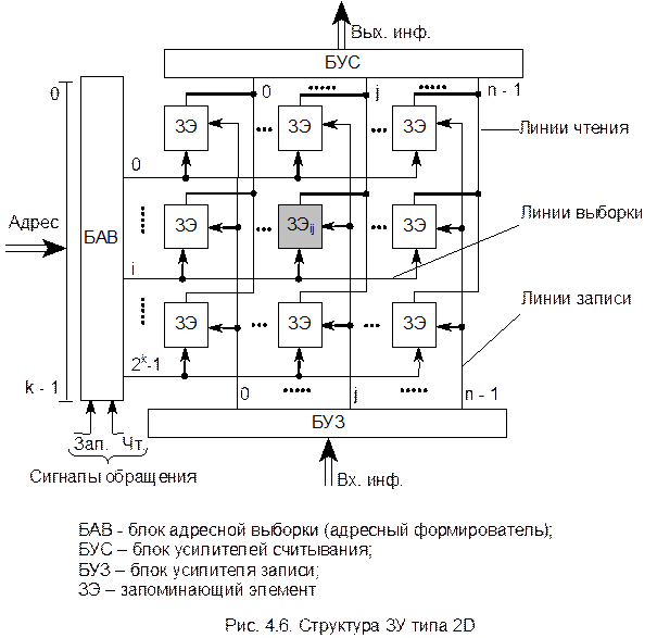 Адрес из k разрядов поступает на блок адресной выборки БАВ (который называют также адресным формирователем), управляемый сигналами Чт и Зап. Основу БАВ составляет дешифратор с 2k выходами, который при поступлении на его вход адреса формирует сигнал для выбора линии i. В зависимости от сигнала Чт или Зап БАВ в общем случае выдает сигнал, настраивающий ЗЭ i-й ячейки (i-й линии) на чтение либо на запись. Выделение разряда j в i-м слове (ЗУ серого цвета) производится второй координатной линией. При записи по линии j от БУЗ поступает сигнал, устанавливающий выбранный для записи ЗЭi,j в состояние 0 или 1. При считывании на БУС по линии j поступает сигнал о состоянии ЗЭi,j. Следует иметь в виду, что ЗЭ должны допускать объединение выходов для работы на общую линию с передачей сигналов только от выбранного ЗЭ. Это свойство ЗЭ используется во всех современных ЗУ. Таким образом, каждая адресная линия выборки ячейки памяти в общем случае передает три сигнала: - выборка при записи; - выборка при считывании; - отсутствие выборки. Однако во многих современных ЗУ достаточно только двух сигналов – выборка и отсутствие выборки.