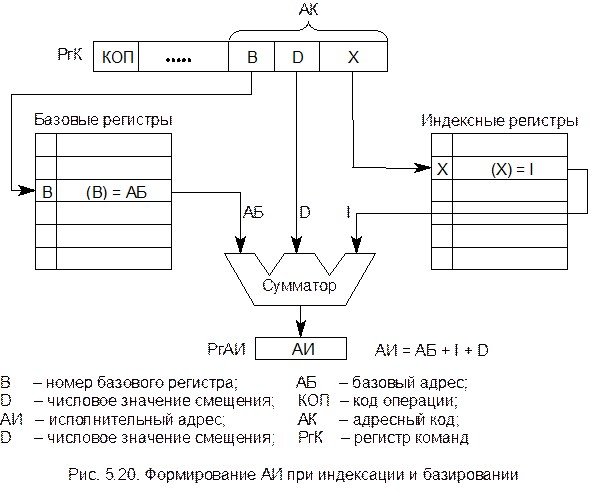 Для выполнения индексации в ЭВМ вводят индексные регистры, в качестве которых могут использоваться либо регистры внутренней памяти процессора, либо внешние по отношению к нему специальные быстродействующие регистры. В некоторых ЭВМ предусмотрена возможность, при определенных условиях, в качестве индексных регистров использовать ячейки ОП. В общем случае при использовании механизма индексации в АК команды выделяют три поля: B – номер базового регистра, D – смещение, X – номер индексного регистра.