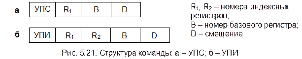 Условный переход по индексу (УПИ) Возможная структура команды показана на рис 5.21, б. Пусть R1 – номер индексного регистра, а R2 – номер регистра, хранящего приращение. Регистр, в котором хранится предельное значение индекса, имеет подразумеваемый адрес и, следовательно, должен быть фиксированным для данного процессора. Пусть это будет регистр, следующий по порядку за регистром, хранящим приращение, т.е. R3. Команда УПИ складывает содержимое регистров R1 и R2, помещает результат сложения в R1 и сравнивает его с содержимым R3. Если результат сложения меньше или равен содержимому R3, то управление передается по адресу АИ = (В) + D, т.е. происходит повторение цикла. В противном случае выполняется переход к команде, следующей по порядку за командой УПИ, т.е. выход из цикла.