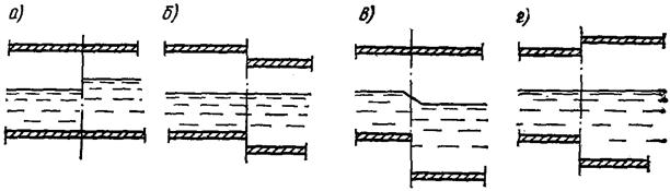 До каналізаційних труб і каналів ставлять вимоги щодо: Ø міцності; Ø водонепроникності; Ø нестираності; Ø хімічної стійкості; Ø гідравлічної гладкості; Ø термостійкості. Матеріал труб вибирають з урахуванням призначення колекторів, складу і властивостей стічних вод і місцевих умов. Широке застосування одержали труби: § керамічні; § бетонні; § залізобетонні зі заздалегідь напруженою арматурою; § із залізобетонних блоків; § азбестоцементні, § чавунні; § пластмасові; § сталеві цільнопротягнуті і електрозварювані; § скляні та ін. Перераховані види матеріалів труб і каналів можна застосовувати для відведення звичайних побутових і виробничих стічних вод, нейтральних (з рН=7) і слабколужних (з рН=8-10). При слабкокислих стоках (з рН=5-6) можна застосовувати керамічні й асбестоцементні безнапірні, для стічних вод середньо- і сильнокислотних (з рН=5-3 і рН=3-2) – кислототривкі керамічні, фаолітові, поліетиленові, вініпластові, скляні; при рН=4-10 і температурі стоків до 60оC – фаолітові або поліпропіленові труби. Для напірних каналізаційних колекторів застосовують чавунні, сталеві, залізобетонні, азбестоцементні труби. Чавунні труби застосовують у випадках, коли мають місце великі зовнішні навантаження, а також в районах обвалів і в зонах санітарної охорони. Сталеві труби використовують в районах з сейсмічністю понад 7 балів. Канали і колектори великих перетинів споруджують із залізобетонних блоків заводського виготовлення, цегли підвищеної якості і міцності. В інженерній практиці застосовують два методи з'єднання труб: «шелига в шелигу» і «за рівнями води». На рис. 5.2, а і б показані схеми з'єднання трубопроводів однакового діаметра, а на рис. 5.2, в і г - різного діаметра. При з'єднанні трубопроводів «шелига в шелигу» (рис. 5.2, а і в) поєднуються верхні частини зводів труб, названі шелигами. Якщо з'єднання труб виконують «за рівнями води» (рис. 5.2, б і г), то поєднуються по висоті розрахункові рівні води. Найбільш поширеною є думка про необхідність з'єднання трубопроводів однакового діаметра «за рівнями води», а різного діаметра - «шелига в шелигу».
