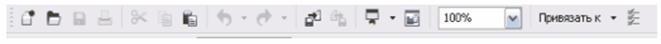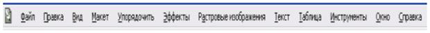 Рис. 2.1 Головне меню CorelDRAW · File (Файл) - команди, що дозволяють відкривати, зберігати, імпортувати, експортувати файли, роздруковувати малюнки, публікувати їх в Internet; в нижній частині списку команди розташований список останніх відкритих файлів; · Edit (Правка) - команди, що дозволяють скасовувати і повторювати останні дії, копіювати об'єкти, налаштовувати їх властивості; · View (Вид) - команди, що дозволяють настроювати вікно відображення об'єктів, встановлювати і налаштовувати допоміжні елементи вікна; · Layout (Макет) - команди, що дозволяють додавати, видаляти та перейменовувати сторінки графічного документа та налаштовувати їх властивості; · Arrange (Упорядкувати) - команди, що дозволяють активізувати інструменти перетворення і вирівнювання об'єктів; · Effects (Ефекти) - команди, що дозволяють додати різні спеціальні ефекти до об'єктів (наприклад, ефекти видавлювання, тіні, прозорості і т.п.); · Bitmaps (Растри) - команди, що дозволяють перетворювати векторні зображення в растрові і навпаки, редагувати растрові зображення і додавати до них різні ефекти; · Text (Текст) - команди для роботи з текстовими об'єктами; · Table (Таблиця) – команда, для створення таблиці · Tools (Інструменти) - команди, що дозволяють настроювати інтерфейс програми, включати і відключати панелі інструментів, а також настроювати їх; · Window (Вікно) - команди, що дозволяють перемикатися між вікнами різних файлів, одночасно відкритих в CorelDRAW, а також викликати додаткові вікна палітр, докерів і панелей інструментів; · Help (Допомога) - команди, що дозволяють звернутися до вбудованої довідкової системі CorelDRAW. Крім того, інтерфейс містить і специфічні елементи (Рис.2.2) Рис. 2.2 Вікно програми CorelDRAW У центрі вікна програми розташована робоча область програми, зображена у вигляді листа паперу. При виведенні зображення на друк буде надруковано тільки те, що знаходиться всередині робочої області. Смуги прокручування дозволяють пересуватися по зображенню, а вимірювальні лінійки - точно позиціонувати елементи малюнка і вимірювати їх розміри. Для роботи з кольором в правій частині вікна розташована палітра кольорів. У рядку стану виводиться додаткова інформація про об'єкти, істотно полегшує роботу з редактором. Крім стандартної панелі інструментів, в CorelDRAW є і специфічні панелі, з яких особливо важливими є панель Toolbox (Інструменти) і панель Property Bar (Панель властивостей). Інструменти панелі Toolbox (Інструменти) дозволяють створювати об'єкти, а елементи панелі Property Bar (Панель властивостей) дозволяють змінювати їх властивості. Щоб розташувати панель інструментів у довільному місці, треба перетягнути її за допомогою миші. Панелі можна закріпити за будь-якого боку вікна програми або розташувати в довільному місці робочого вікна. Головне меню також є панеллю, і його місце розташування також можна змінити. Будь-яку панель інструментів можна відобразити або не відображати в робочому вікні. Для цього досить вибрати команду меню Window / Toolbars (Вікно / Панелі інструментів) і встановити відповідні прапорці: для стандартної панелі - Standard (Основна), для головного меню програми - Menu Bar (Панель меню), для панелі властивостей - Property Bar (Панель властивостей), для панелі інструментів - Toolbox (Інструменти) і для рядка стану - Status Bar (Рядок стану). 2.2 Стандартна панель інструментів Стандартна панель інструментів, яка відображається за замов