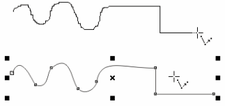 Подвійним клацанням малювання кривої завершиться. Інструментами Без`є і Перо можна малювати лінії по проміжку за раз, точно розміщуючи кожен вузол і контролюючи форму кожної зігнутої лінії. При малюванні інструментом Перо можна попередньо переглядати сегменти створюваної лінії, при цьому побудова йде безперервна, від точки до точки. При інструменті Без`є також контролюється побудова і можна побачити місце розташування наступної точки, але в цей момент можна відвернутися і змінити інший інструмент, продовжуючи малювати.