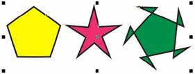 Так само, як при роботі з прямокутником і еліпсом, перетягуємо будь-який з вузлів. За допомогою цих дій можна отримати екзотичні фігури (Рис. 6.7, в центрі і праворуч). Можна міняти кількість вершин багатокутників, перетворювати їх на зірки і назад. Це робиться точно так само, як і при їх створенні, про що було розказано вище. Є ще одна особливість зміни форми багатокутників. Можна додавати вузли в контур, що зараз і зробимо. Створюємо ще один п'ятикутник, після чого вибираємо інструмент "Shape Tool" в панелі Toolbox (Графіка). Цей інструмент призначений для роботи з вузлами. Двічі клацнемо мишею на одній зі сторін п'ятикутника, приблизно посередині між вузлами. На місці клацання, а також в аналогічному місці на всіх інших сторонах п'ятикутника, з'являться нові вузли (Рис. 6.8, ліворуч).