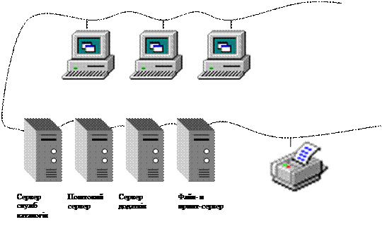 Спеціалізовані сервери: Коло завдань, які повинні виконувати сервери, різноманітне і складне. Щоб пристосуватися до зростаючих потреб користувачів, сервери в більших мережах стали спеціалізованими (specislized). Наприклад, у мережі Windows NT існують різні типи серверів. Ø Файли-сервери й принт-серверы. Файли-сервери й принт-сервери управляють доступом користувачів відповідно до файлів і принтерів. Наприклад, щоб працювати з текстовим процесором, Ви насамперед повинні запустити його на своєму комп'ютері. Документ текстового процесора, що зберігається на файлі-сервері, завантажується на Вашому комп'ютері, і, таким чином, Ви можете працювати із цим документом на своєму комп'ютері. Інакше кажучи, файл-сервер призначен для зберігання файлів і даних. Ø Сервери додатків. На серверах додатків виконуються прикладні частини клієнт-серверних додатків, а також перебувають дані, доступні клентам. Наприклад, щоб спростити витяг даних, сервери зберігають більші обсяги інформації в структуризированому виді. Ці сервери відрізняються від файл- і принт-серверов. В останніх файл або дані цілком коипруются на запитуючий комп'ютер. А в сервері додатків на запитуючий комп'ютер пересилаються тільки результати запиту. Додаток-клієнт на вилученому комп'ютері одержує доступ до даних, збереженим на сервері додатків. Однак замість всієї бази даних на Ваш комп'ютер завантажуються тільки результати запиту. Наприклад, Ви можете одержати список працівників, що народилися в листопаді. Ø Поштові сервери Поштові сервери управляють передачею електронних повідомлень між користувачами мережі. Ø Факси-сервери Факси-сервери управляють потоком вхідних і вихідних факсимільних повідомлень через один або кілька факсів-модемів. Ø Комунікаційні сервери Комунікаційні сервери управляють потоком даних і поштових повідомлень між цією мережею й іншими мережами, мэйнфремами або вилученими користувачами через модем і телефонну лінію. Служба каталогів призначена для пошуку, зберігання й захисту інформації в мережі. Windows NT Server поєднує комп'ютери в логічні групи - домены (domain), - система захисту яких наділяє користувачів різними правами доступу до будь-якого мережного ресурсу. У розширеній мережі використання серверів різних типів здобуває особливу актуальність. Необхідно тому враховувати всі можливі нюанси, які можуть виявитися при розростанні мережі, для того, щоб зміна ролі певного сервера надалі не позначилося на роботі всієї мережі.