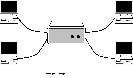 При топології «зірка» всі комп'ютери за допомогою сегментів кабелю підключаються до центрального компонента, іменованому концентратором (hub). Сигнали від передавального комп'ютера надходять через концентратор до всіх інших. Ця топологія виникла на зорі обчислювальної техніки, коли комп'ютери були підключені до головного комп'ютера. У мережах з топологією «зірка» підключення кабелю й керування конфігурацією мережі централізовані. Але є й недолік: тому що всі комп'ютери підключені до центральної точки, для більших мереж значно збільшується витрата кабелю. До того ж, якщо центральний компонент вийде з ладу, порушиться робота всієї мережі. А якщо вийде з ладу тільки один комп'ютер (або кабель, що з'єднує його з концентратором), то лише цей комп'ютер не зможе передавати й одержувати сигнали. На інші комп'ютери в мережі це не вплине.