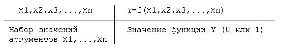 4. Способи заданя логічних функцій. Логічні змінні, логічні функції й логічні елементи. Логічна змінна - це змінне, приймаюче значення 0 або 1. Логічна змінна ще називається аргумент логічної функції. Логічна функція - це функція логічних змінних, котра може приймати тільки одне із двох значень: 0 або 1. Логічний елемент - це пристрій, що реалізує ту або іншу логічну функцію. Y=f(X1,X2,X3,...,Xn) - логічна функція, вона може бути задана таблицею, що називається таблицею істинності.