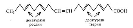 Цей процес каталізується поліферментним комплексом, який називають синтетазою жирних кислот. Кінцевим продуктом її дії є С16-пальмітинова кислота. У рослинах є ще дві синтетази жирних кислот – складні ферментні системи. Одна з них подовжує вуглецевий ланцюг кислоти від С16 до С18, друга – від С18 до С30 і більше. Синтетази жирних кислот у рослинних клітинах локалізовані в цитозолі, у стромі хлоропластів та в сферосомах. Перетворення насичених жирних кислот у ненасичені відбувається за допомогою десатуразної ферментної системи, що вводить подвійний зв'язок у молекулу насиченої кислоти незалежно від довжини її вуглецевого ланцюга. Однак найчастіше субстратом десатурази є С18-стеаринова кислота, а продуктом – олеїнова. У реакції використовується NАDРН і O2. Десатурази рослин мають ряд відмінностей від тваринних. Вони локалізовані в матриксі цитоплазми та в сферосомах, а тваринні – у мембранах ЕР. Рослинні десатурази можуть використовувати для реакцій електрони безпосередньо від фотосистеми при фотосинтезі. Подальше перетворення мононенасичених жирних кислот у ди- і триненасичені ще недостатньо вивчено. Однак припускають участь у цьому процесі спеціальних десатураз. Відомо також, що в цих реакціях потрібні NАDРН і O2. Десатурази у тварин утворюють поліненасичені жирні кислоти, вводячи подвійні зв'язки між уже існуючим подвійним зв'язком і карбоксильною групою, а у рослин – між наявним і кінцевою метильною групою.