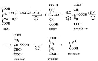 Схема гліоксилатного циклу и глюконеогенезу Перші три реакції гліоксилатного циклу ідентичні таким же реакціям циклу трикарбонових кислот. Спочатку ацетил-СоА конденсується з оксалоцетатом з утворенням цитрату під дією цитратсинтази. Цитрат потім ізомеризується в ізоцитрат під впливом аконітат-гідратази. Проміжною сполукою в цій реакції є цис-аконітат. Четверта реакція характерна тільки для гліоксилатного циклу: під дією ферменту ізоцитрат-ліази молекула ізоцитрату розщеплюється на сукцинат і гліоксилат. Сукцинат виходить з циклу і далі перетворюється у вуглеводи, а гліоксилат вступає в наступну реакцію циклу.