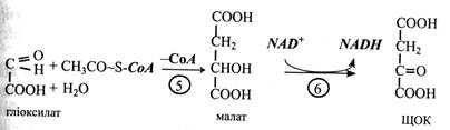 Продукт гліоксилатного циклу – сукцинат залишає гліоксисому, тому що в ній немає ферментів для його подальшого перетворення, і переходить у мітохондрію. Тут під впливом ферментів ЦТК він перетворюється на ЩОК. Спочатку, за дії сукцинат-дегідрогенази, сукцинат перетворюється на фумарат. Останній приєднує воду під впливом фумарат-гідратази, і утворюється малат. Малат-дегідрогеназа окислює малат до оксало-ацетату. При декарбоксилюванні останнього за участю АТР виникає ФЕП.