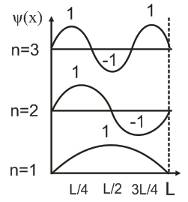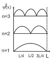 ψ (x) = ASin(nPi/L)x Условие нормировки: (интеграл от 0 до L) (A2Sin2(nPix/L) dx) =1 A2 1/2 (интеграл от 0 до L) (1 -Cos(2nPix/L) dx) =1 A2 1/2 [(интеграл от 0 до L)(dx) - (интеграл от 0 до L) (Cos(2nPix/L) dx)] =1 A2 1/2 [x| - ((1/2n(Pi/L)) (Sin(2nPix/L))) |] =1 A2 L/2 = 1 A = sqr (2/L) ψ (x) = sqr (2/L) Sin(nPi/L)x Ψ (x) = sqr (2/L) e –i/ ħ (Et) Sin(nPi x /L) n=1 ψ 1 = sqr (2/L) Sin(Pi x/L) E= Pi2ħ2/2mL2 n=2 ψ 2 = sqr (2/L) Sin(2Pi x/L) E= 4Pi2ħ2/2mL2 n=3 ψ 2 = sqr (2/L) Sin(3Pi x/L) E= 9Pi2ħ2/2mL2
