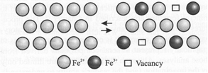 Тверді розчини вакансій Інший спосіб не порушити електронейтральність кристалу при гетеровалентному ізоморфізмі полягає в зміні числа катіонів (або аніонів) у формулі без зміни самої кристалічної структури. У цьому випадку частина точок певної кристалохімічної позиції залишається незайнятою, вакантною, Незайняті позиції називаються вакансіями і позначається значком c. Утворюється дефектний твердий розчин з дефіцитом катіонів (або, що рідше, аніонів): (A2+)1(B2+)1(C2-)2 à (A2+)0,5(D3+)1(C2-)2 і в структурі залишається 0,5 зайнятих А-позицій і 0,5 вакантних А-позицій. Необхідно сказати, що в таких випадках, коли концентрація структурних вакансій досягає великої величини, кристалічна структура часто стає нестійкою і в ній з'являються впорядкування розподілу вакансій, тобто виникають зони сегрегації (скупчення) вакансій усередині гомогенного кристалу. Дуже добре вивчені в цьому відношенні мінерали групи піротину Fe1-xS. У цій формулі х > 0 означає частку вакантних позицій атомів Fe. Якщо частка х велика (більше або близько 10%), то виникає стехіометрична фаза типу Fe7S8, у структурі яких вакансії групуються в окремих плоских сітках, що протягуються через всю структуру. Граничне число вакансій, яке може акумулювати в собі структура, залишаючись стійкою, різне для різних структур.