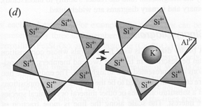 a. Кристалічна структура a–кварцу. b. Конфігурація чотирьохвалентних іонів (Ge, Tі), що заміщують Sі. c. Схема заміщення двох сусідніх позицій Sі4+ парою P5+ + Al3+. d. Входження тривалентних катіонів (Al, Fe, B) в позицію Sі4+ викликає дисбаланс заряду 1+. Баланс заряду досягається входженням одновалентних катіонів (Lі, Na, K) в канали, що проходять паралельно осі c або коли дефекти структури є достатніми для входження в них великого катіону. (Larsen et al, 2004)