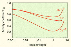 Коефіцієнт активності залежить від загальної концентрації фонового розчину (наприклад розчину NaCl, чи як для морської води Ca-Na-Mg-Cl-HCO3-SO4) і заряду катіонів цього розчину. Інтегруючим показником при цьому є іонна сила I, що визначається за рівнянням: