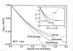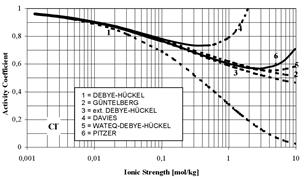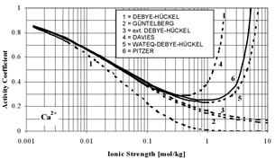 Цей вираз можна застосовувати лише для розбавлених розчинів (< 1 m). Маючи значення іонної сили із хімічних аналізів, значення коефіцієнту активності γі можна розрахувати виходячи із декількох апроксимаційних рівнянь, що ґрунтуються на положеннях теорії електростатичних взаємодій в розчині - теорії Дебая-Гюкеля. Згідно цієї теорії, електроліти в розчині дисоційовані повністю; додатні та від‘ємні іони закономірно чергуються в просторі. Навколо кожного із іонів формується сфера, де поява протилежно заряжених частинок різко зростає (іонна атмосфера). Термодинамічні властивості розчинів пов‘язуються із параметрами іонної атмосфери - її розмірами та густиною. Рівняння, вперше запропоноване у 1923 році, уточнювалося різними дослідниками. Кожне із наведених нижче рівнянь дійсне тільки в певному інтервалі значень іонної сили.